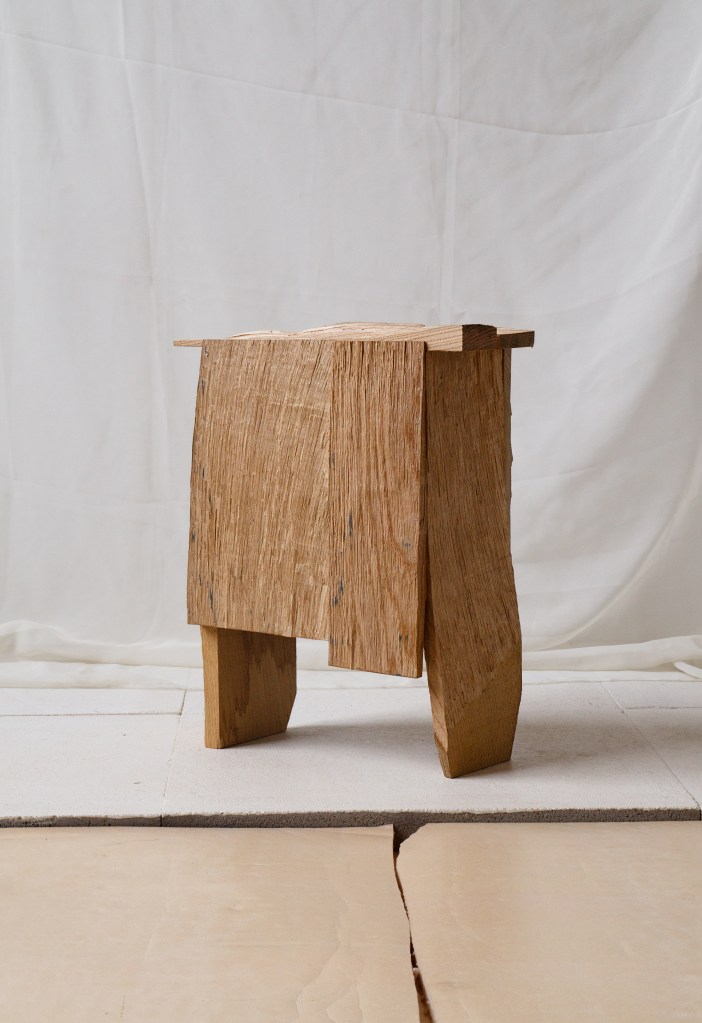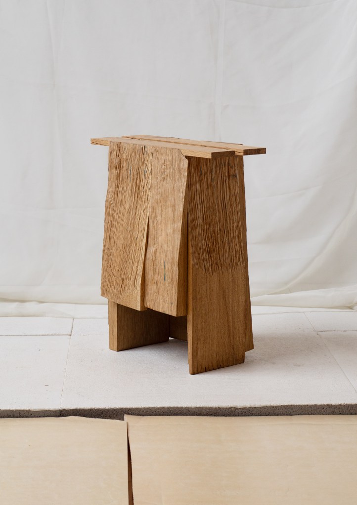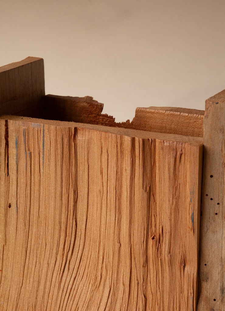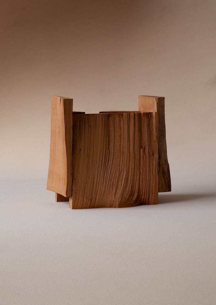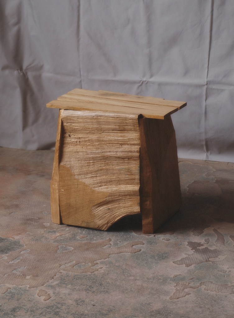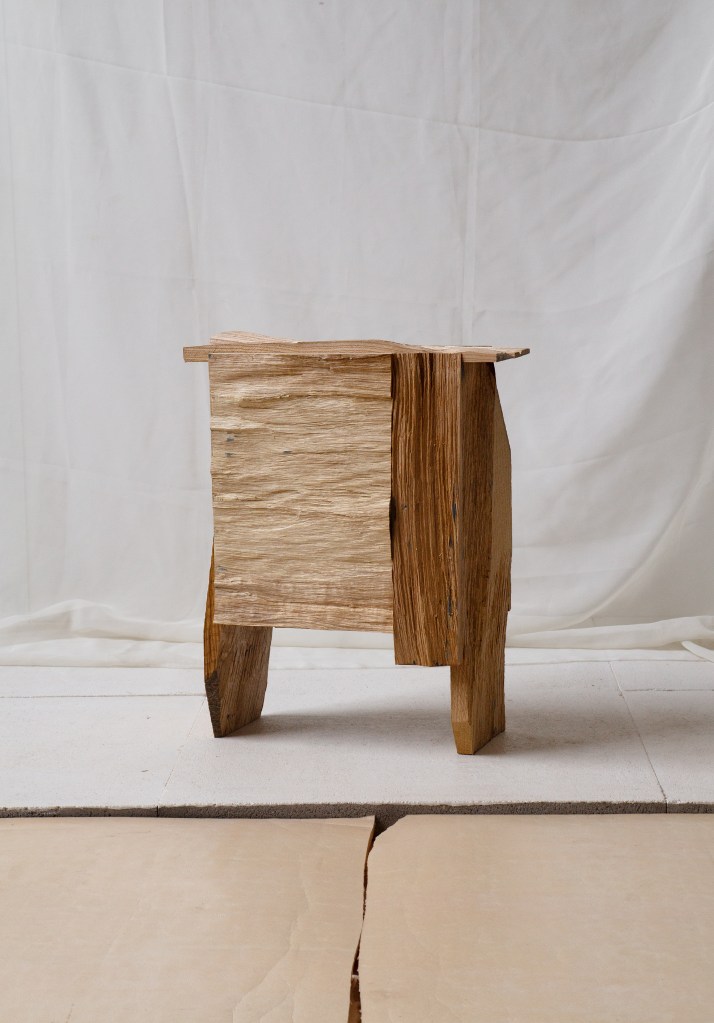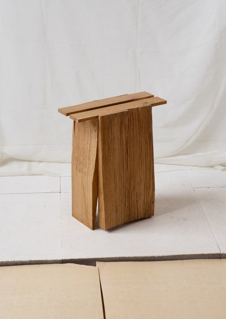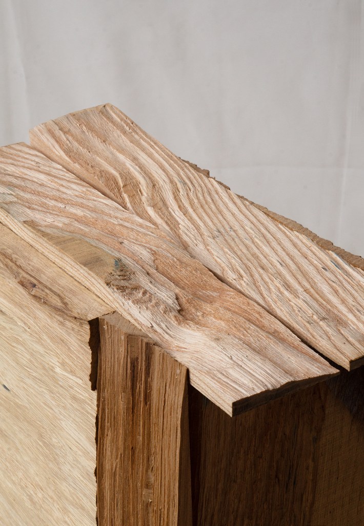 L’objectif est ici d’employer cet artisanat afin de composer des objets aux formes libres, dévoilant d’une part la brutalité des coupes, et d’autre part la singularité de chaque essence de bois.