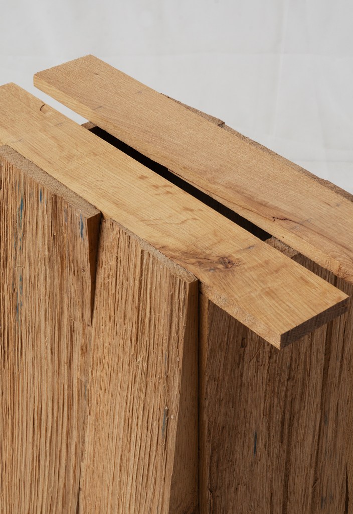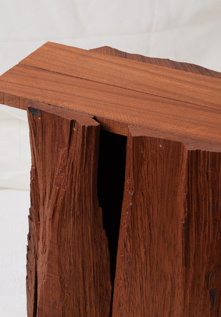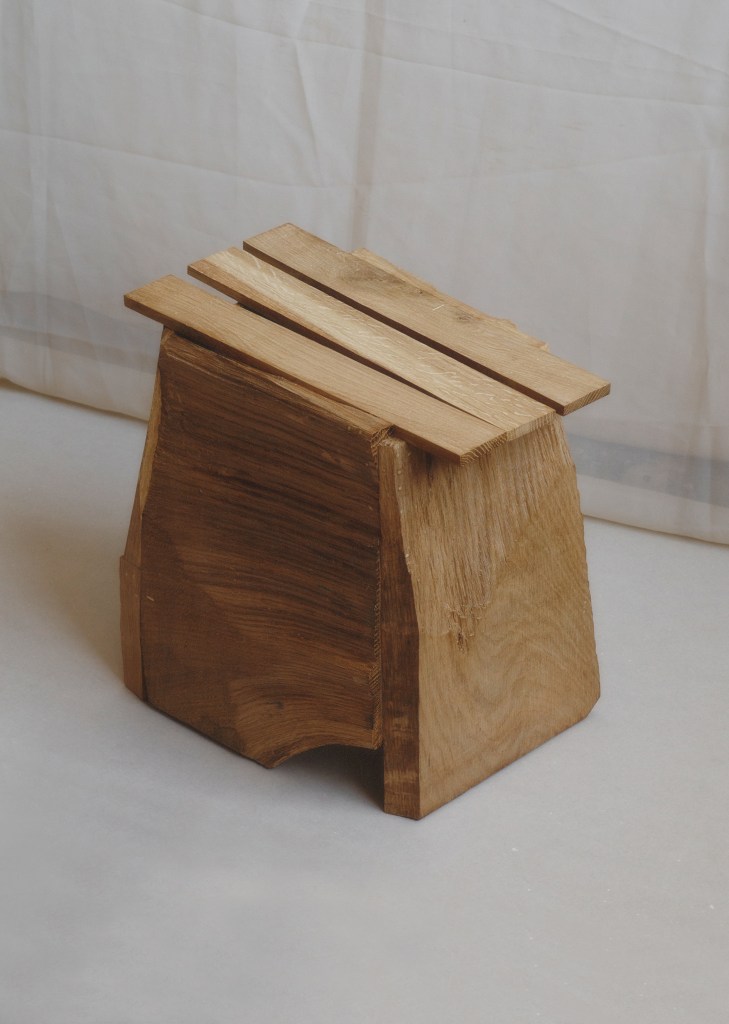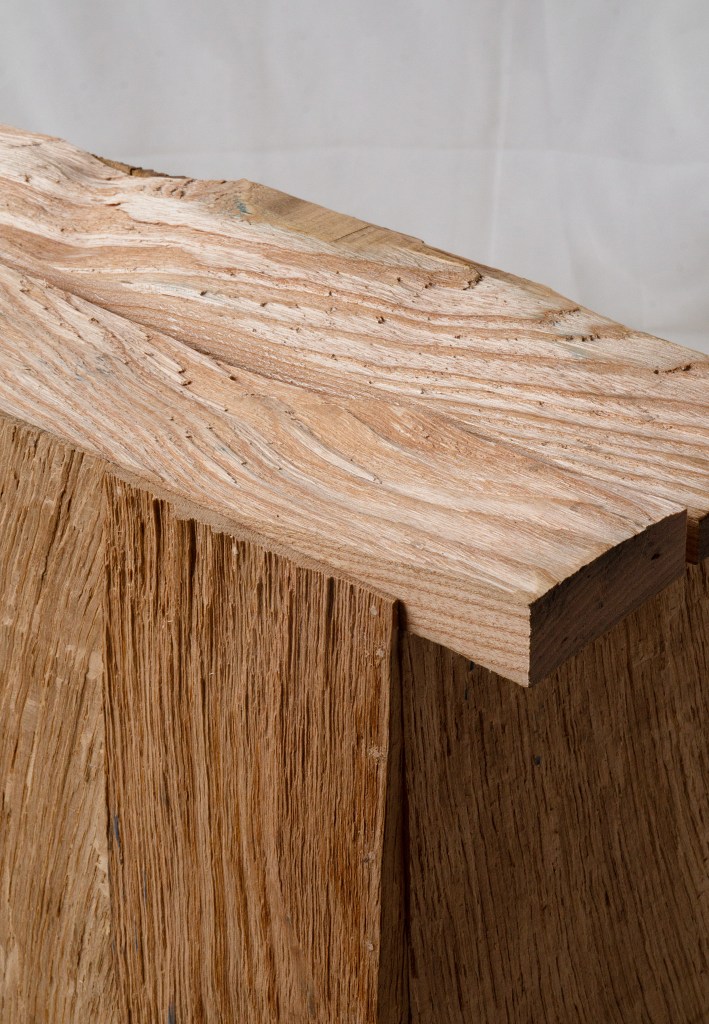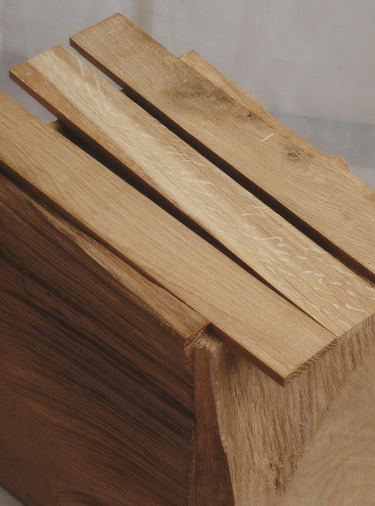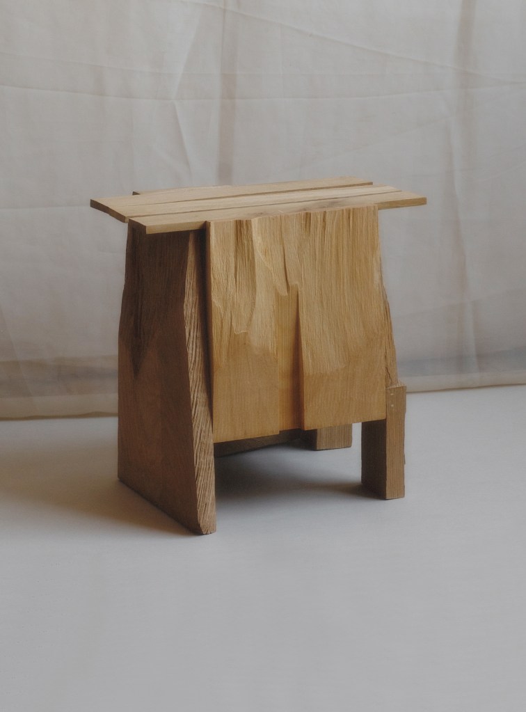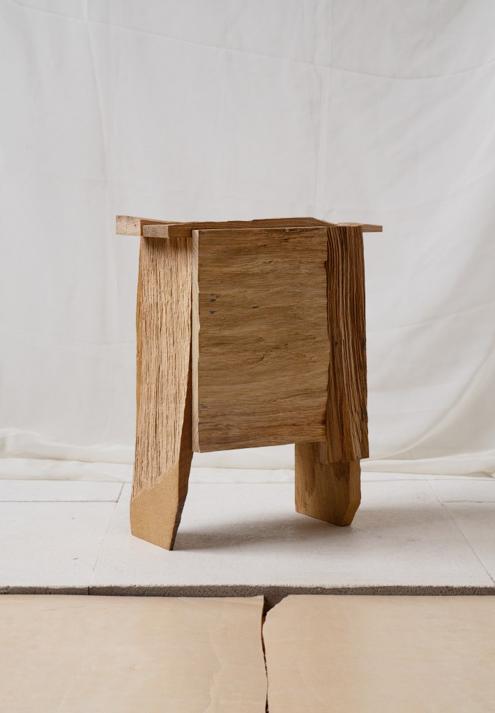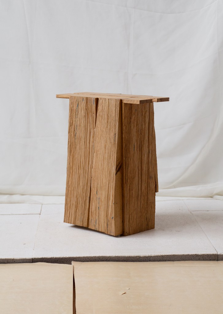 L’objectif est ici d’employer cet artisanat afin de composer des objets aux formes libres, dévoilant d’une part la brutalité des coupes, et d’autre part la singularité de chaque essence de bois.
