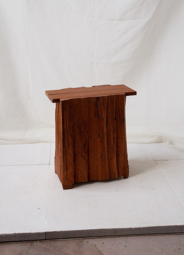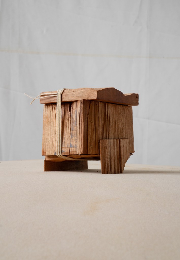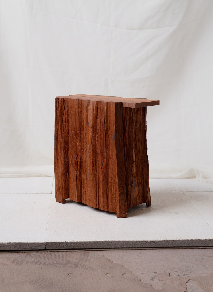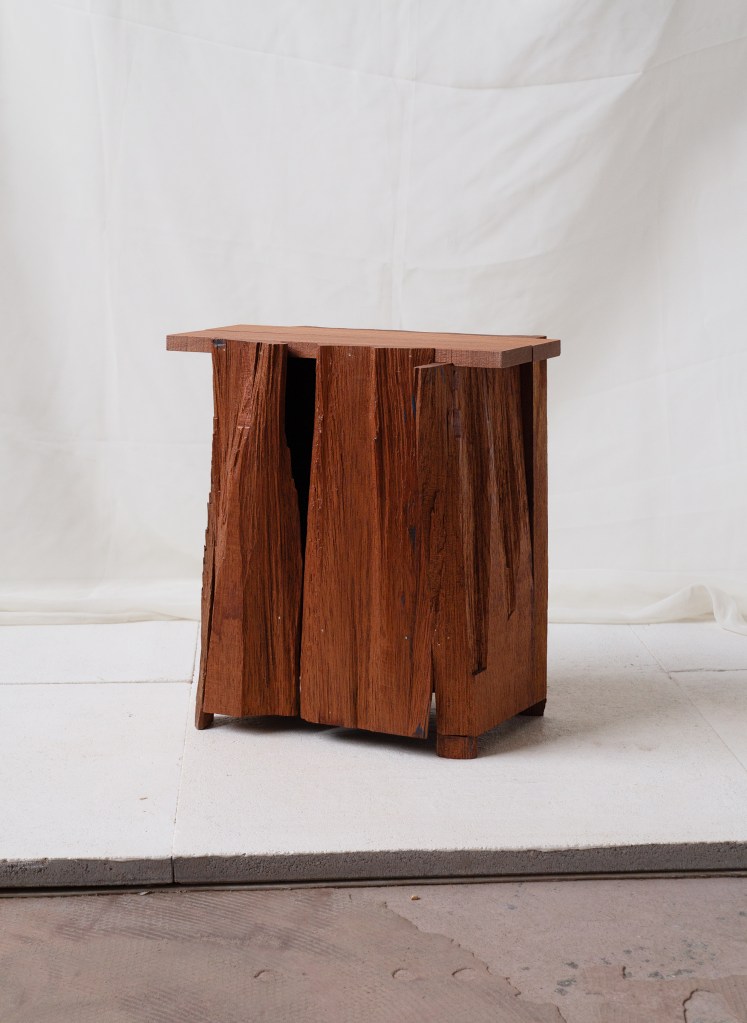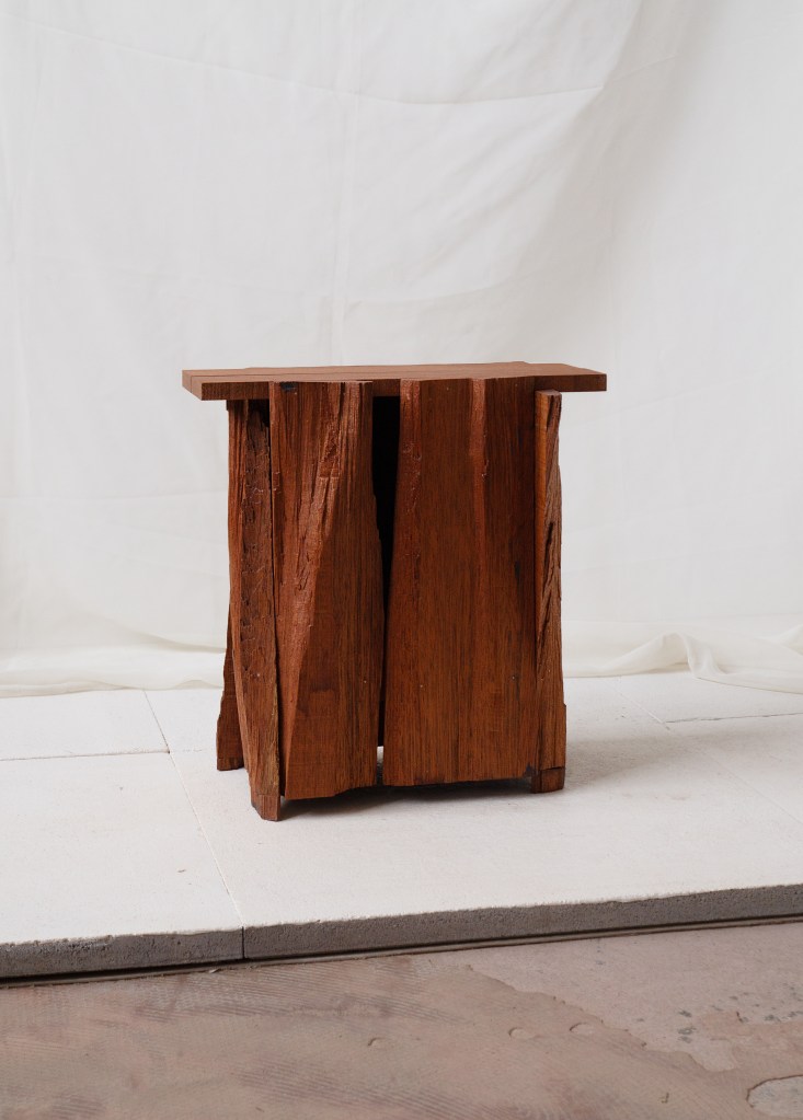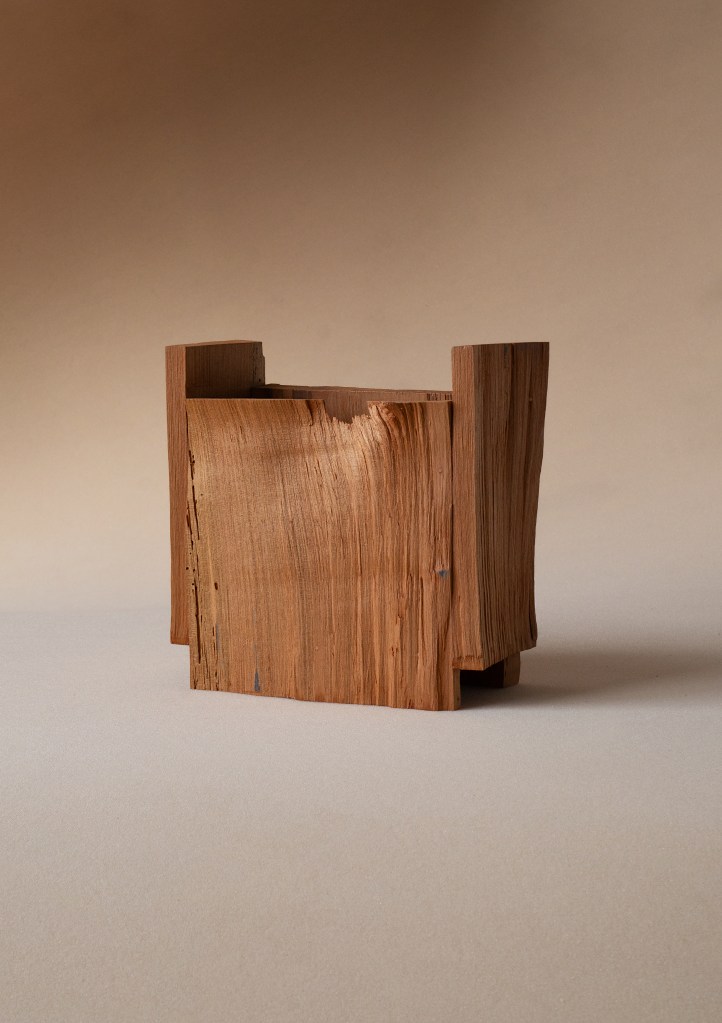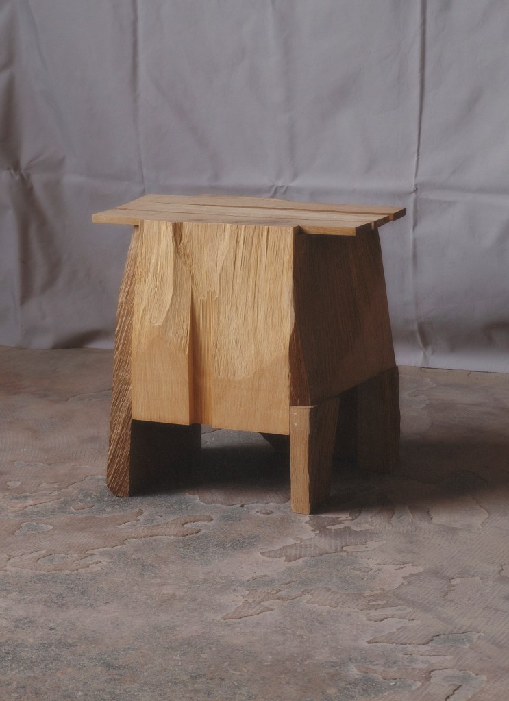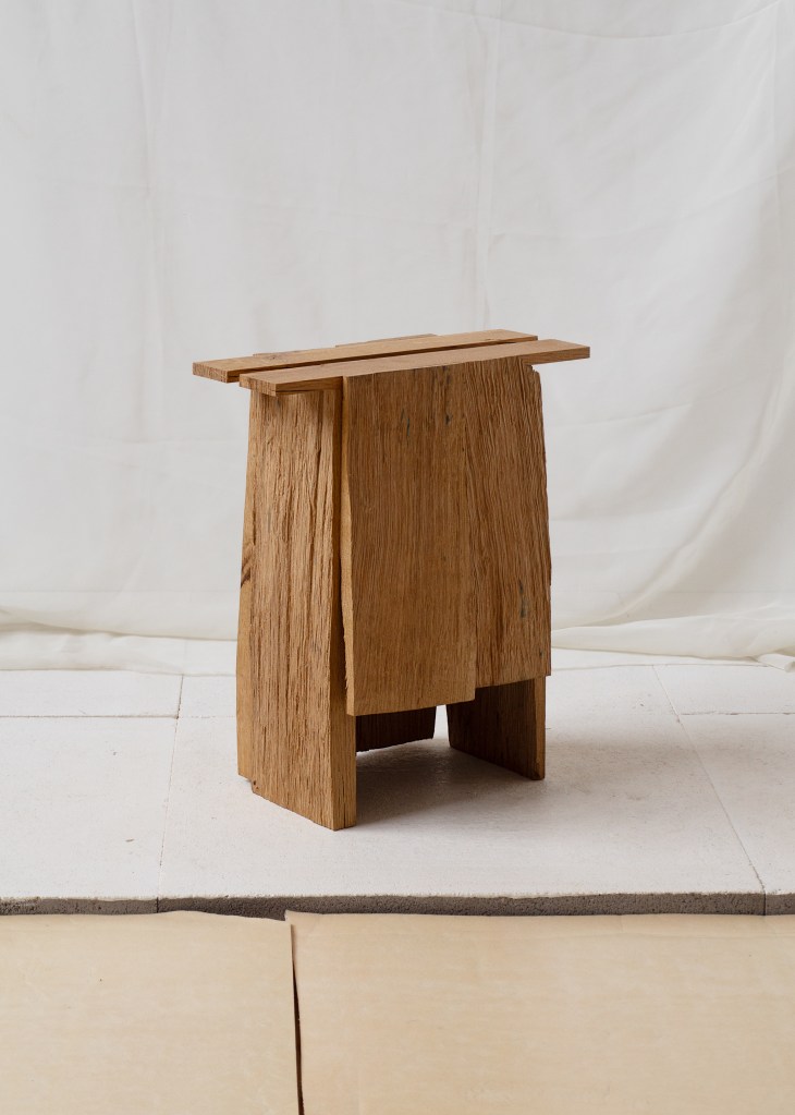 L’objectif est ici d’employer cet artisanat afin de composer des objets aux formes libres, dévoilant d’une part la brutalité des coupes, et d’autre part la singularité de chaque essence de bois.