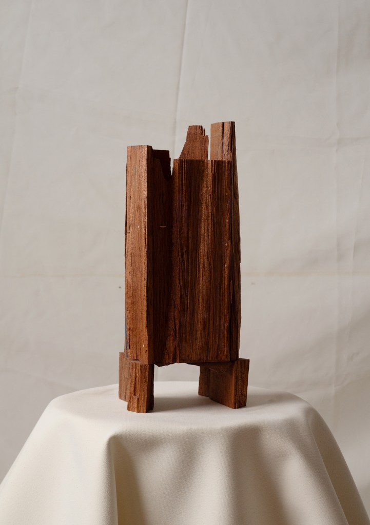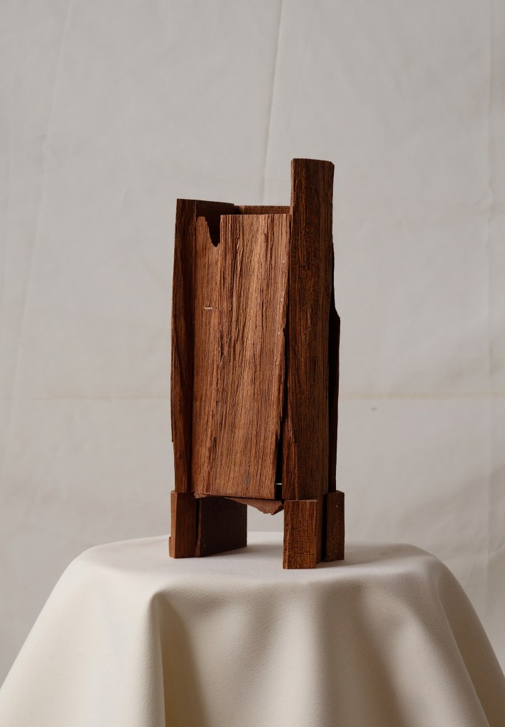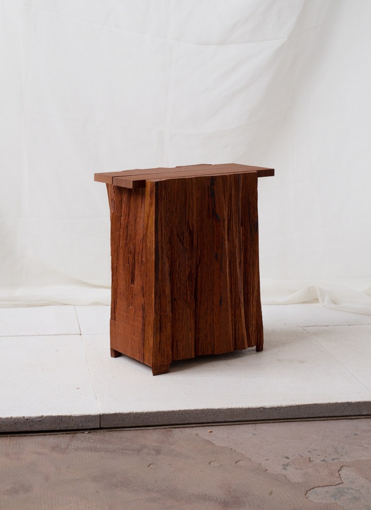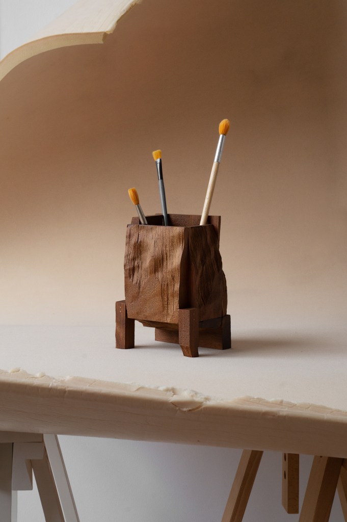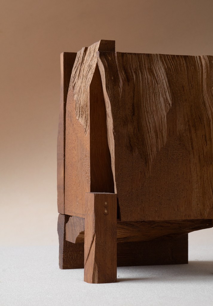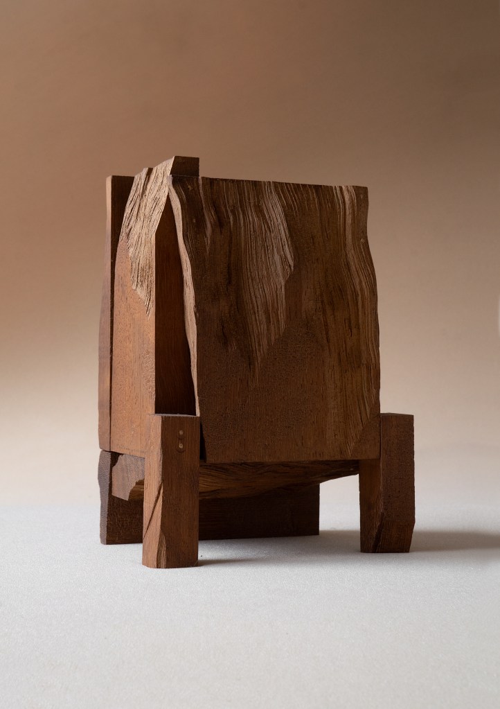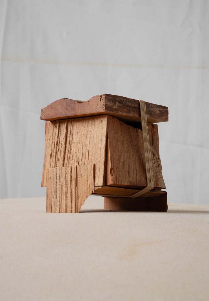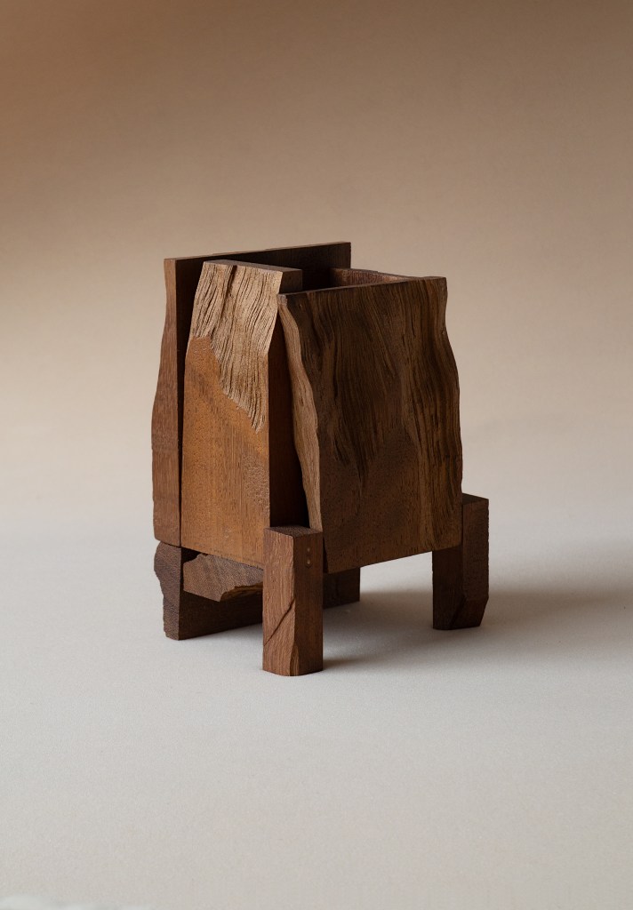 L’objectif est ici d’employer cet artisanat afin de composer des objets aux formes libres, dévoilant d’une part la brutalité des coupes, et d’autre part la singularité de chaque essence de bois.