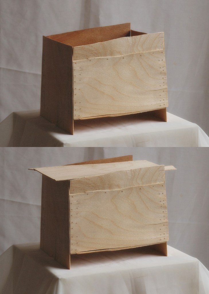 bois peuplier contreplaqué (5 mm), sapin, chevilles bouleau, cire d’abeille.