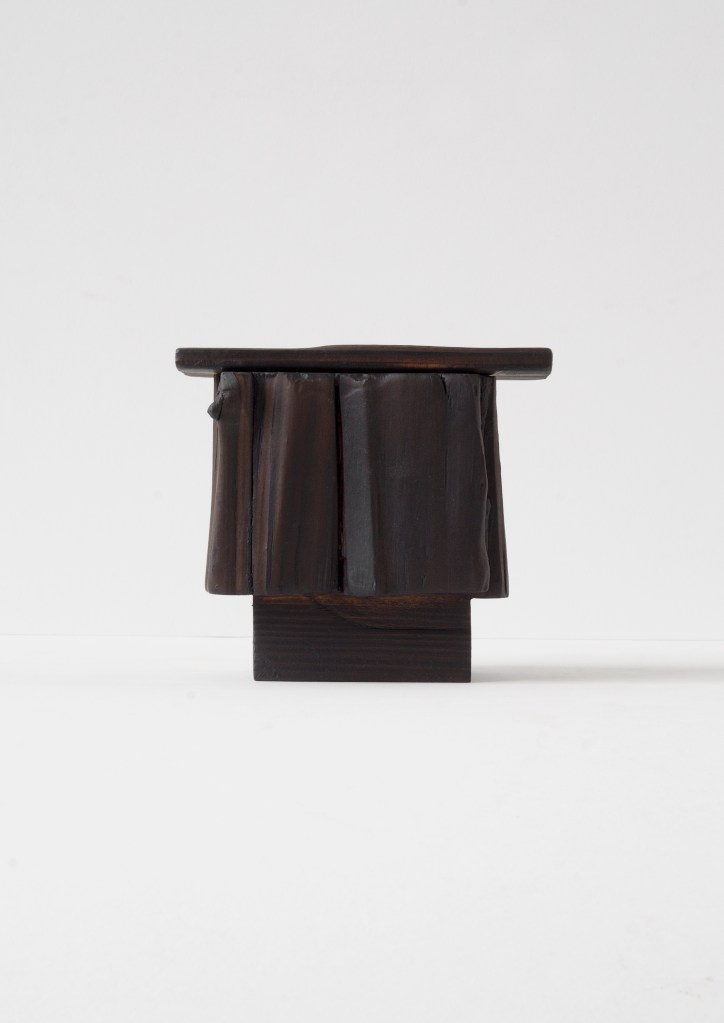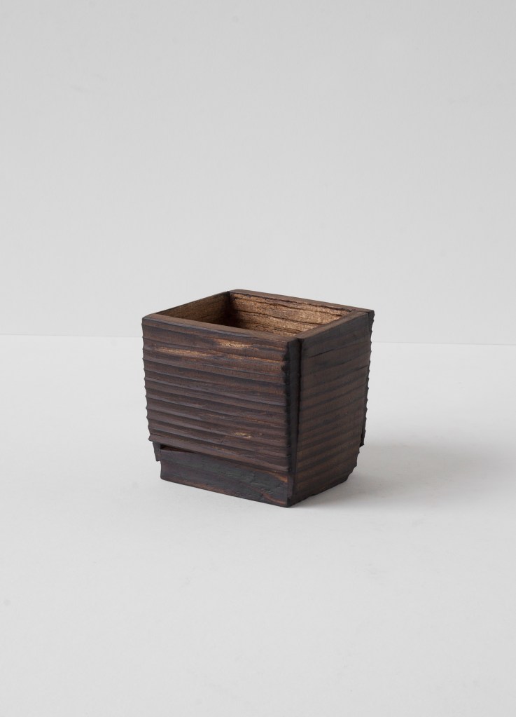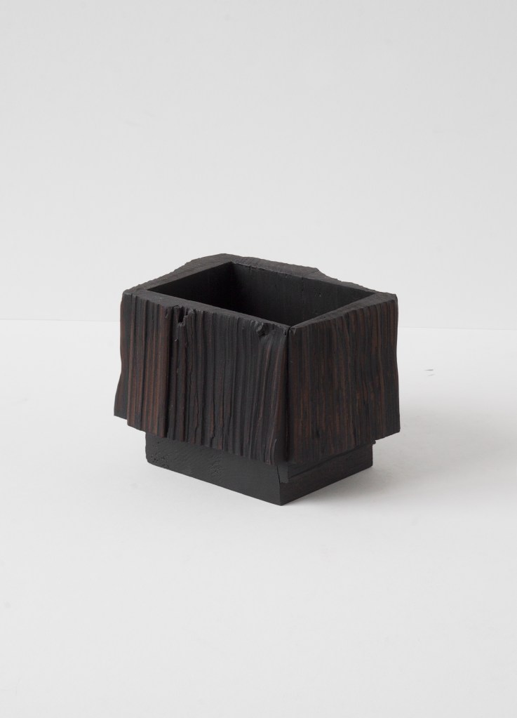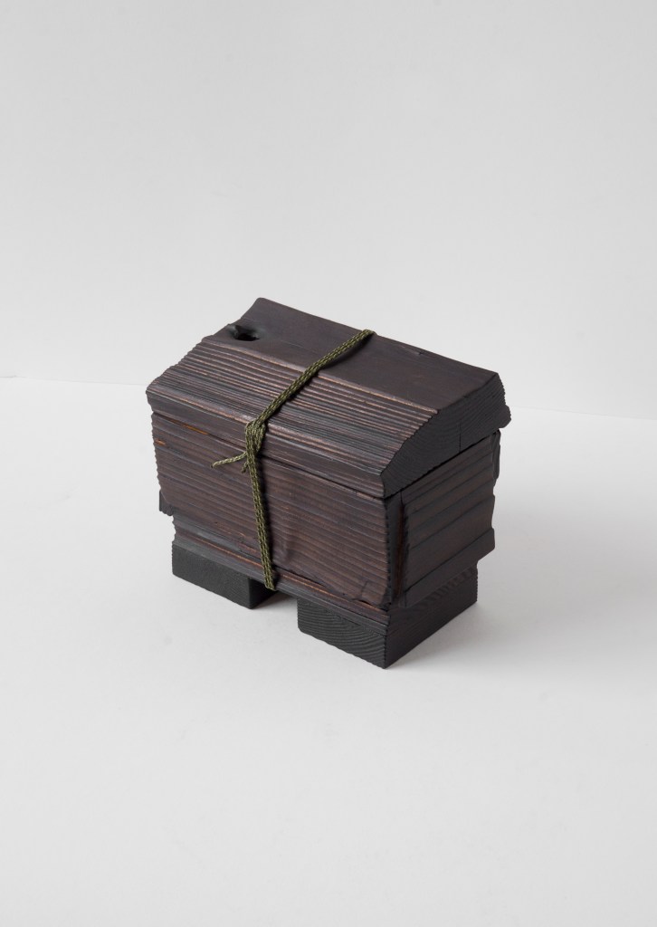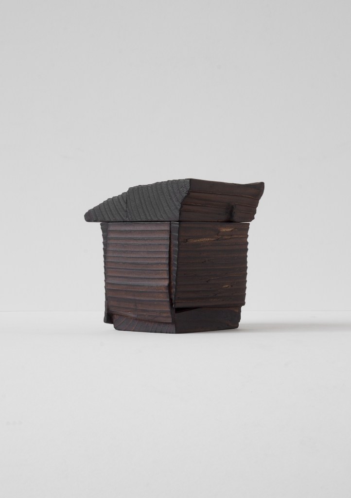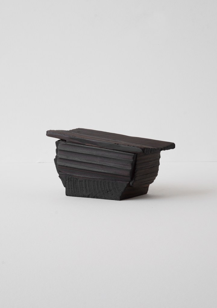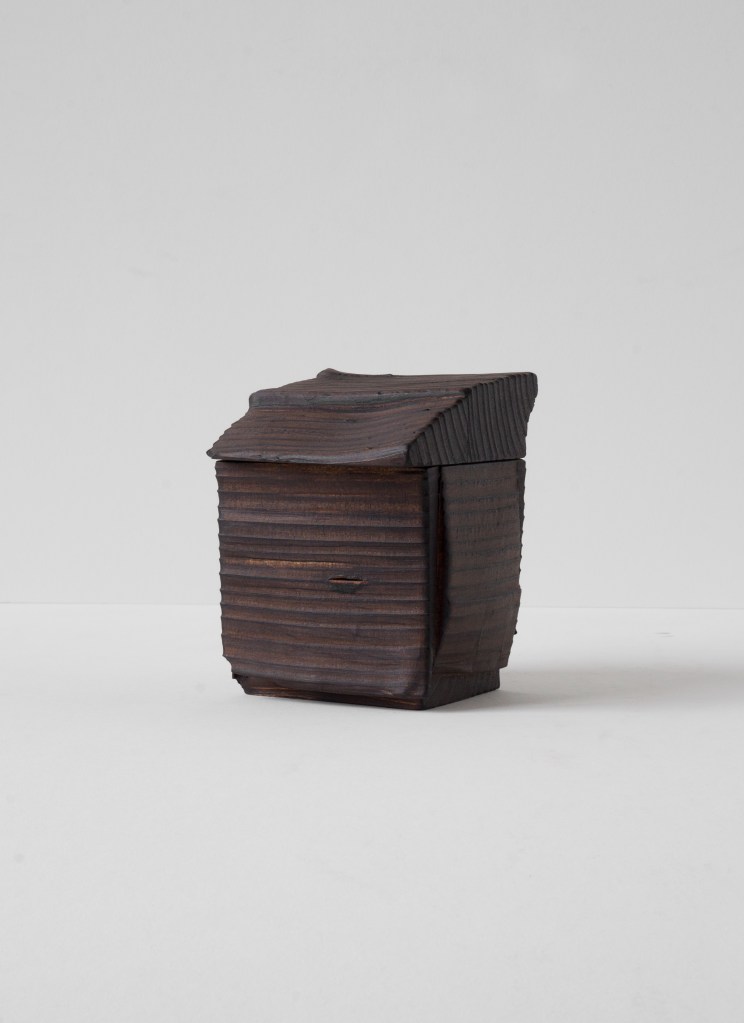 une poutre en bois massif est découpée à l’aide d’un burin (taille dans le sens des veines du bois). Les morceaux sont judicieusement sélectionnés en fonction de l’épaisseur et de la longueur nécéssaire pour former les parois de la boite. Le couvercle est par la suite réalisé avec une encoche convenant à la taille de l’intérieur de l’écrin. Une fois le volume monté, le bois est teinté au Brou de noix, puis brûlé au chalumeau.